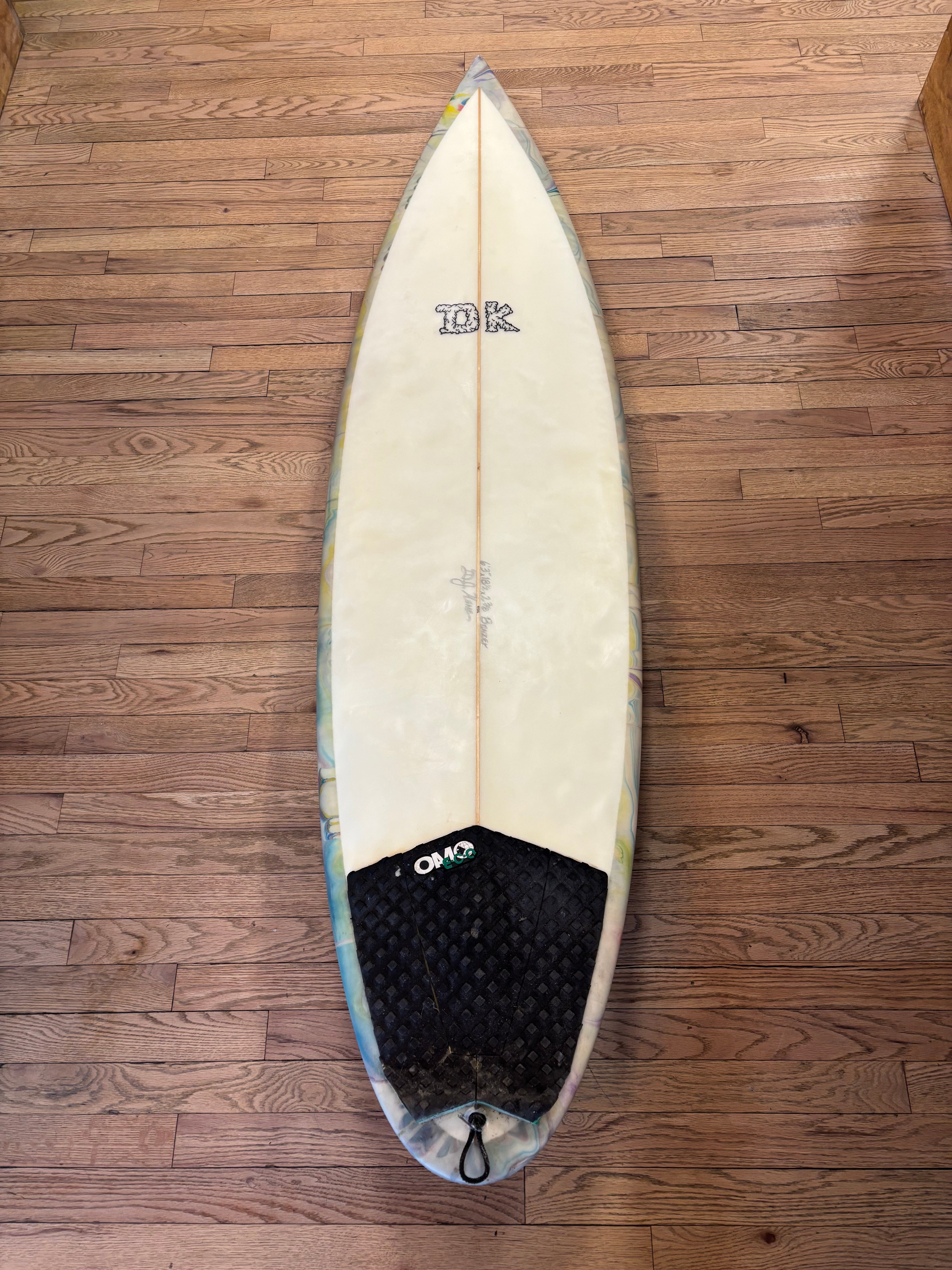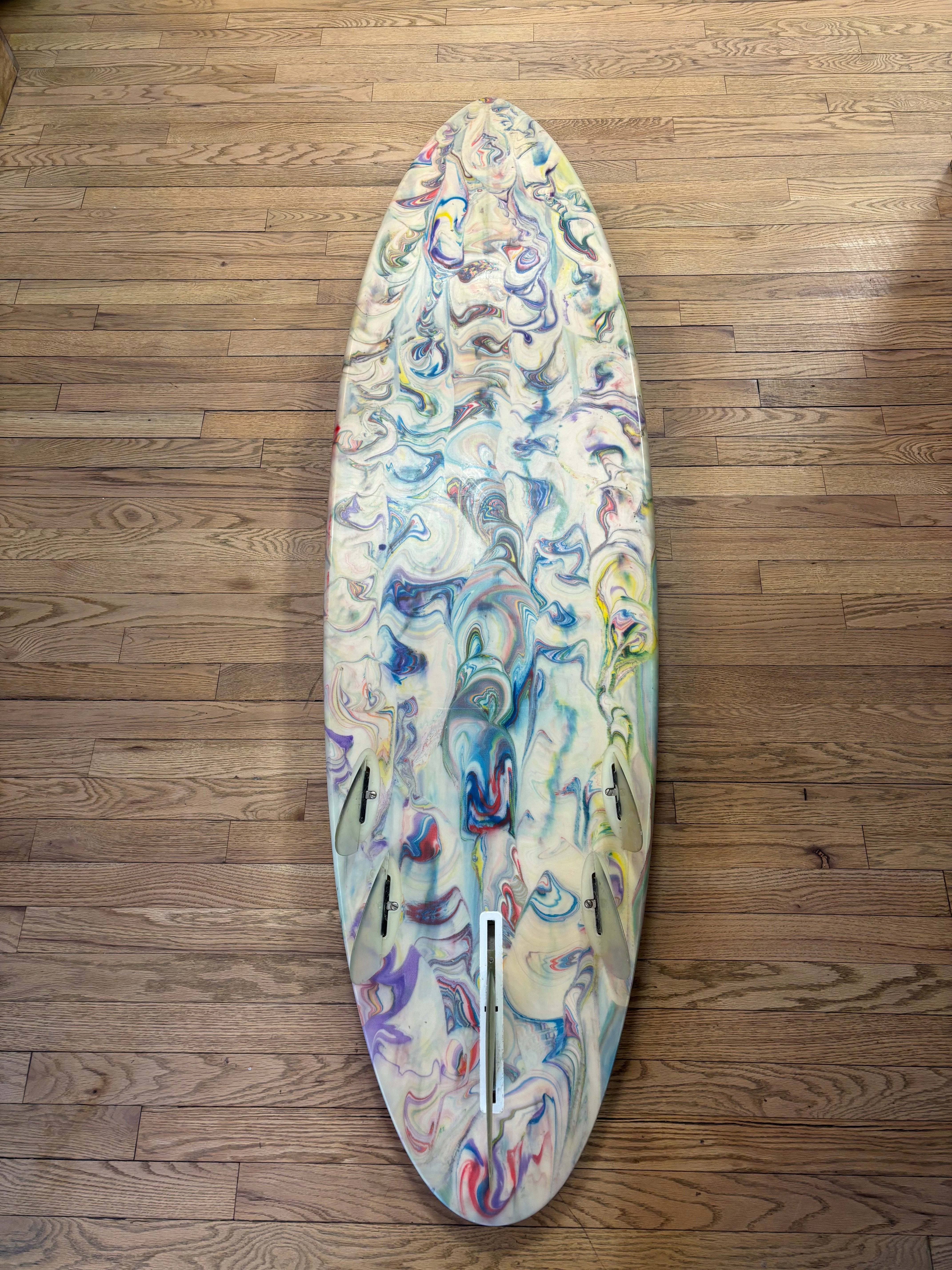 A super unique custom 6’3 Bonzer with a full resin swirl bottom and classic Bonzer fin setup. This board is all about drive, control, and speed, especially in clean NJ/NY surf where you want hold without losing flow.