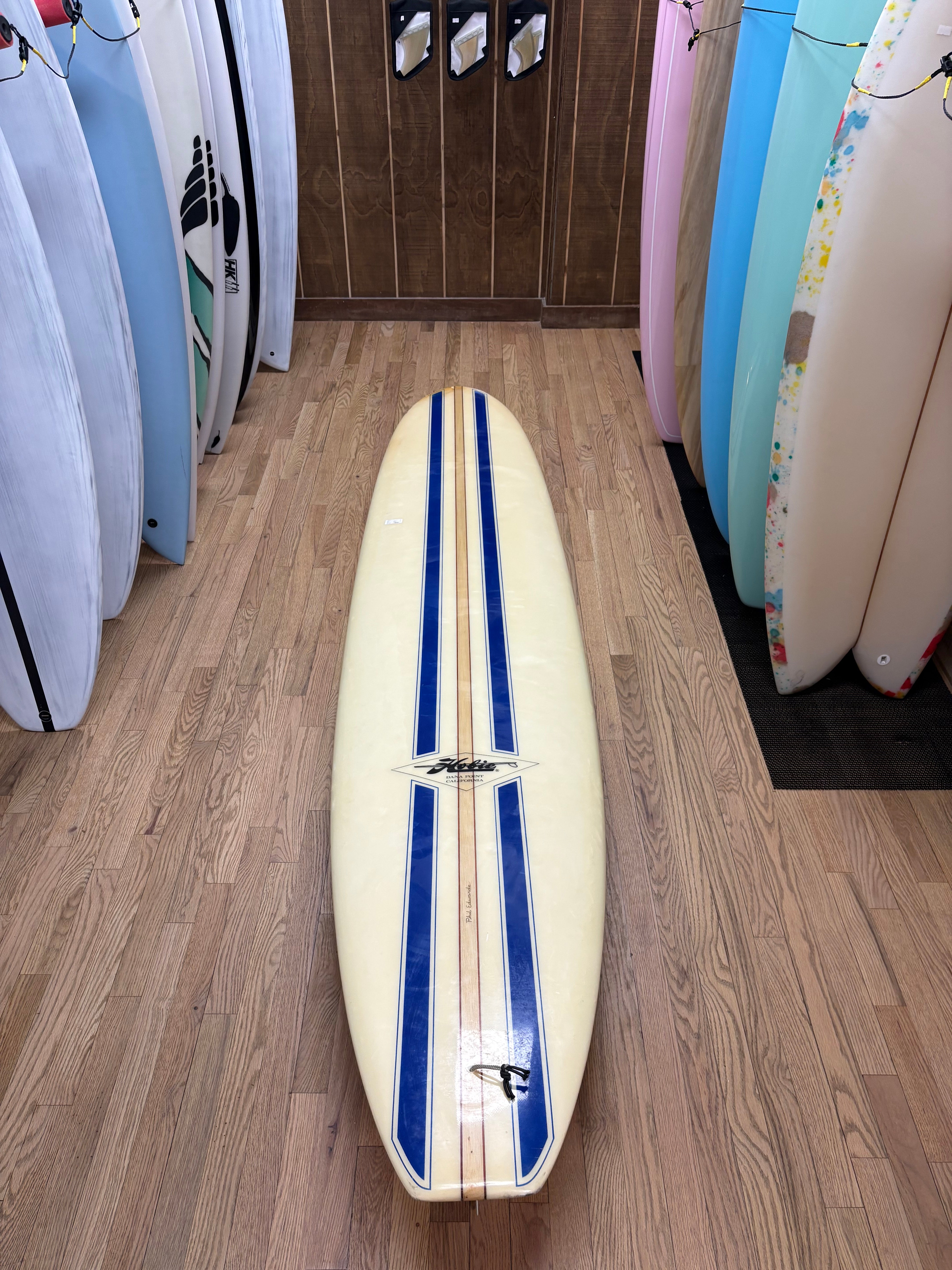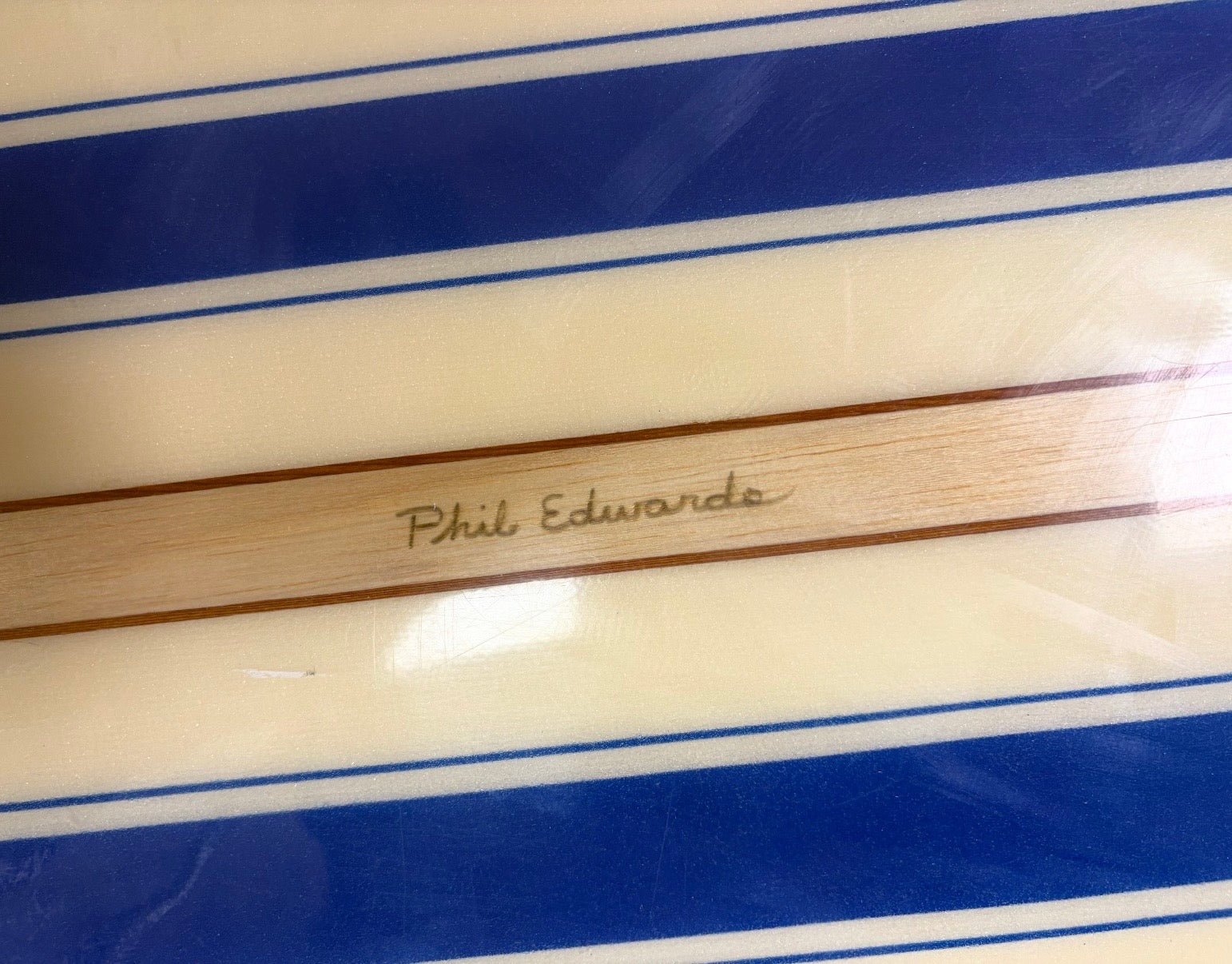 Features classic blue resin pinlines, a beautiful wood stringer with “Phil Edwards” signature, and the iconic Hobie diamond logo. This board represents the timeless longboard style Hobie is known for.